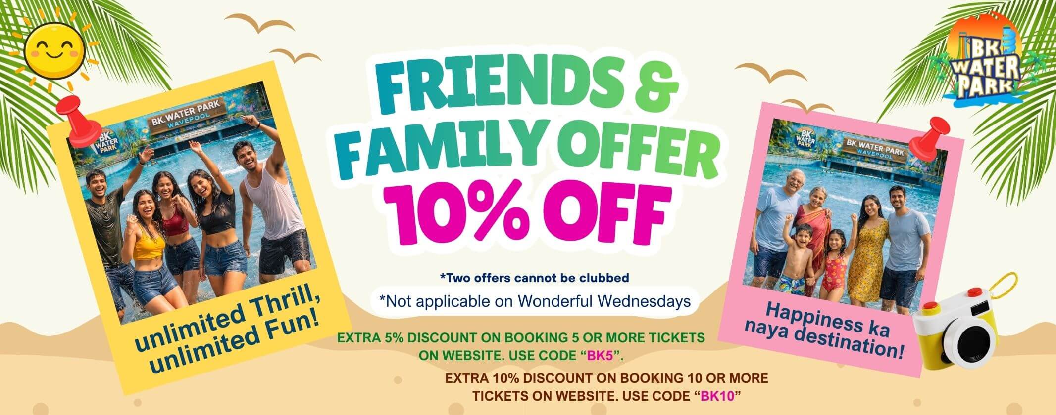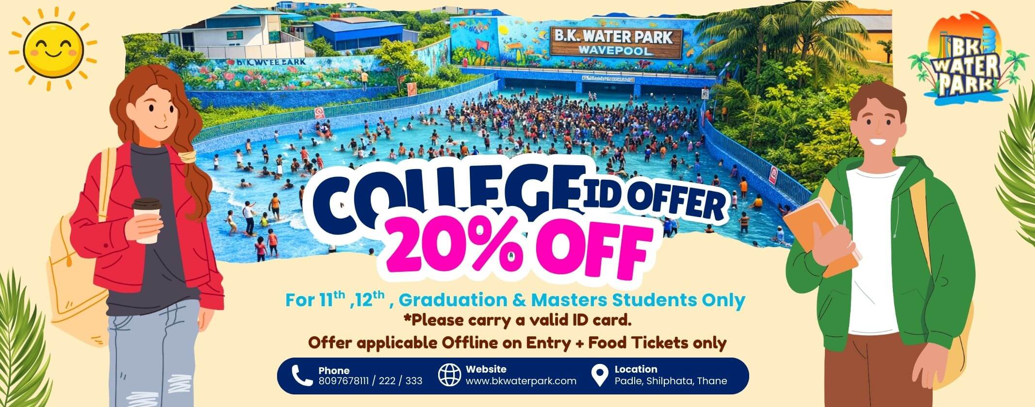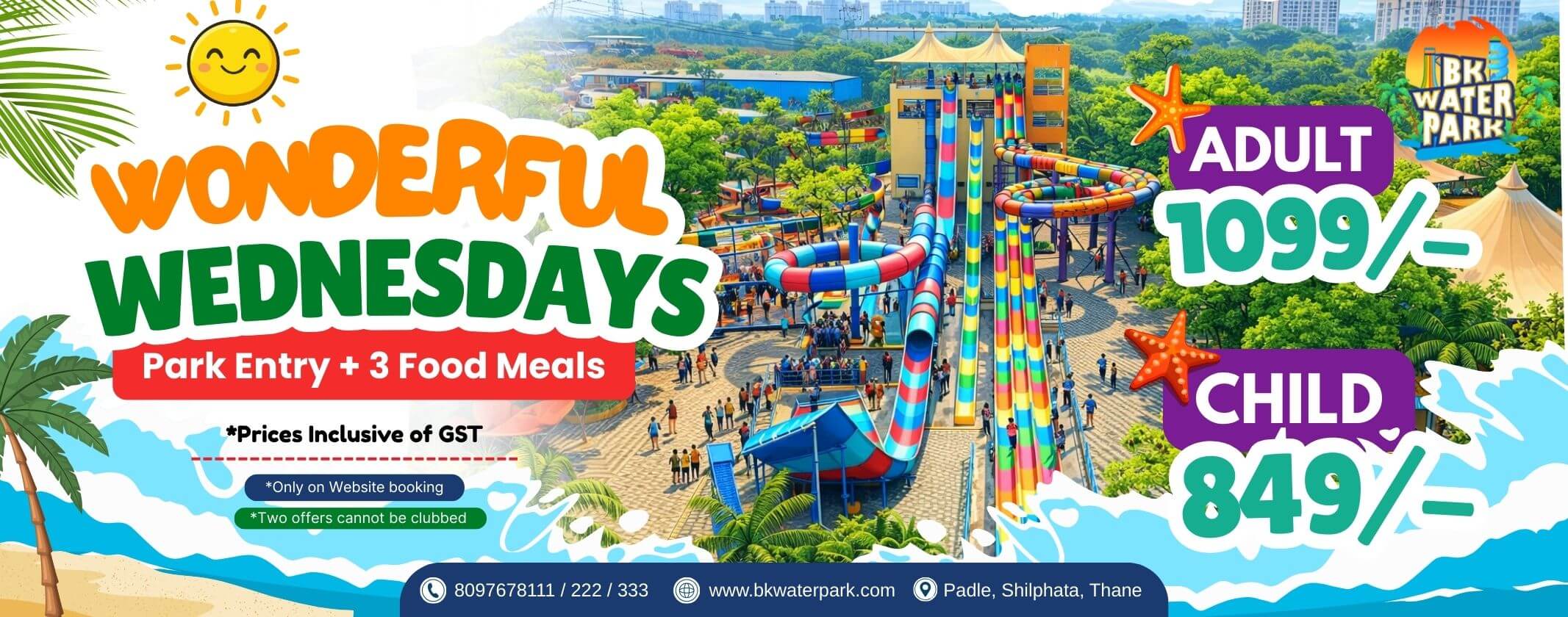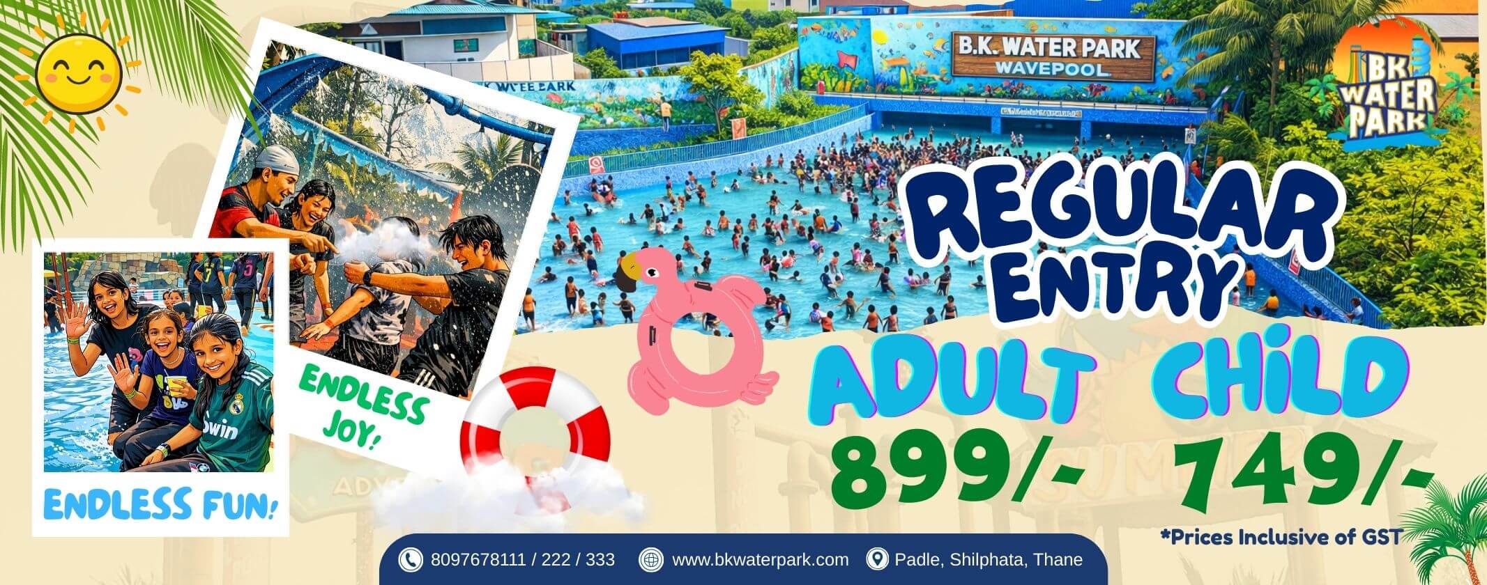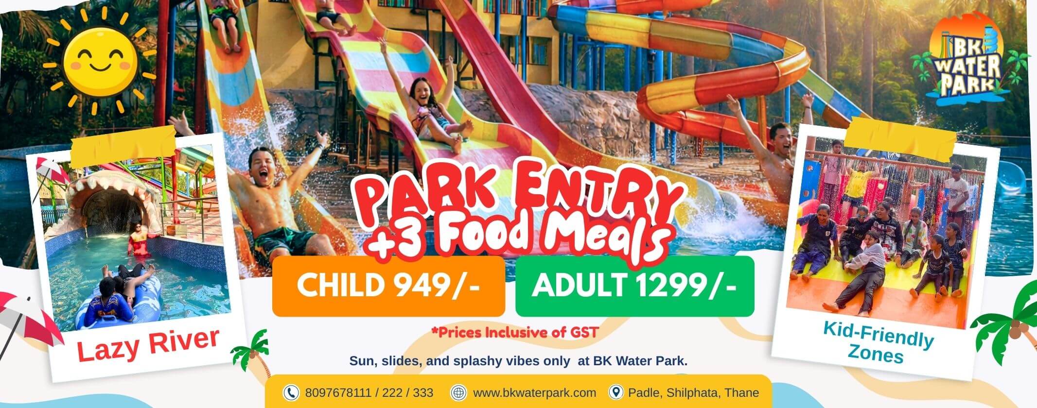 BK Waterpark, spreaded in a 10 acres of lush greenery and tall palms at Kalyan- Shilphata highway, Thane is a perfect picnic destination. The Waterpark excels in customer service and satisfaction by providing world class safety and security and top notch cleanliness and hygiene.